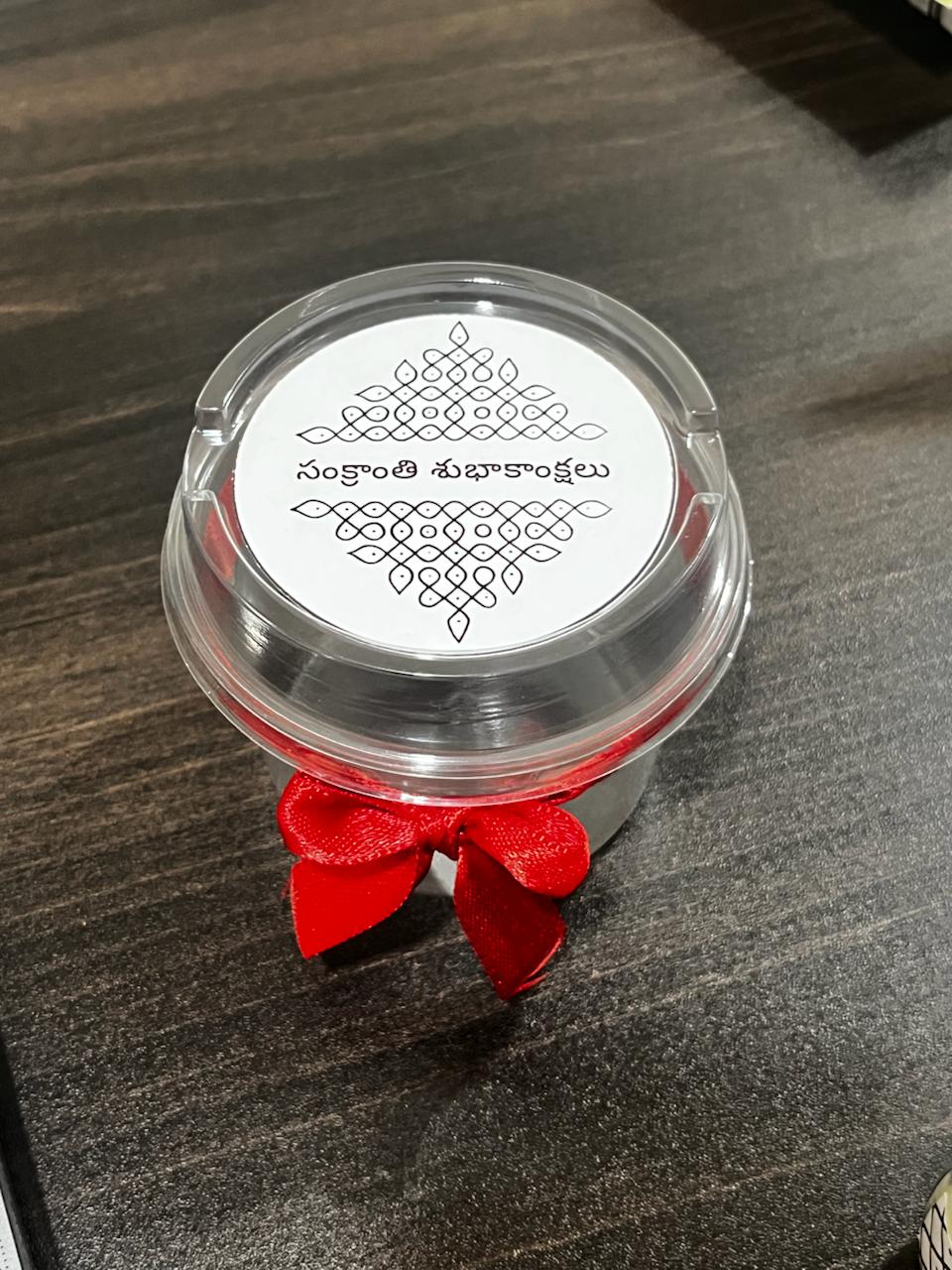 Celebrate Pongal in style with these 250ml round transparent cups featuring traditional kolam artwork and Telugu greetings on the flat lid. Perfect for presenting festival sweets, desserts, or beverages with cultural elegance.