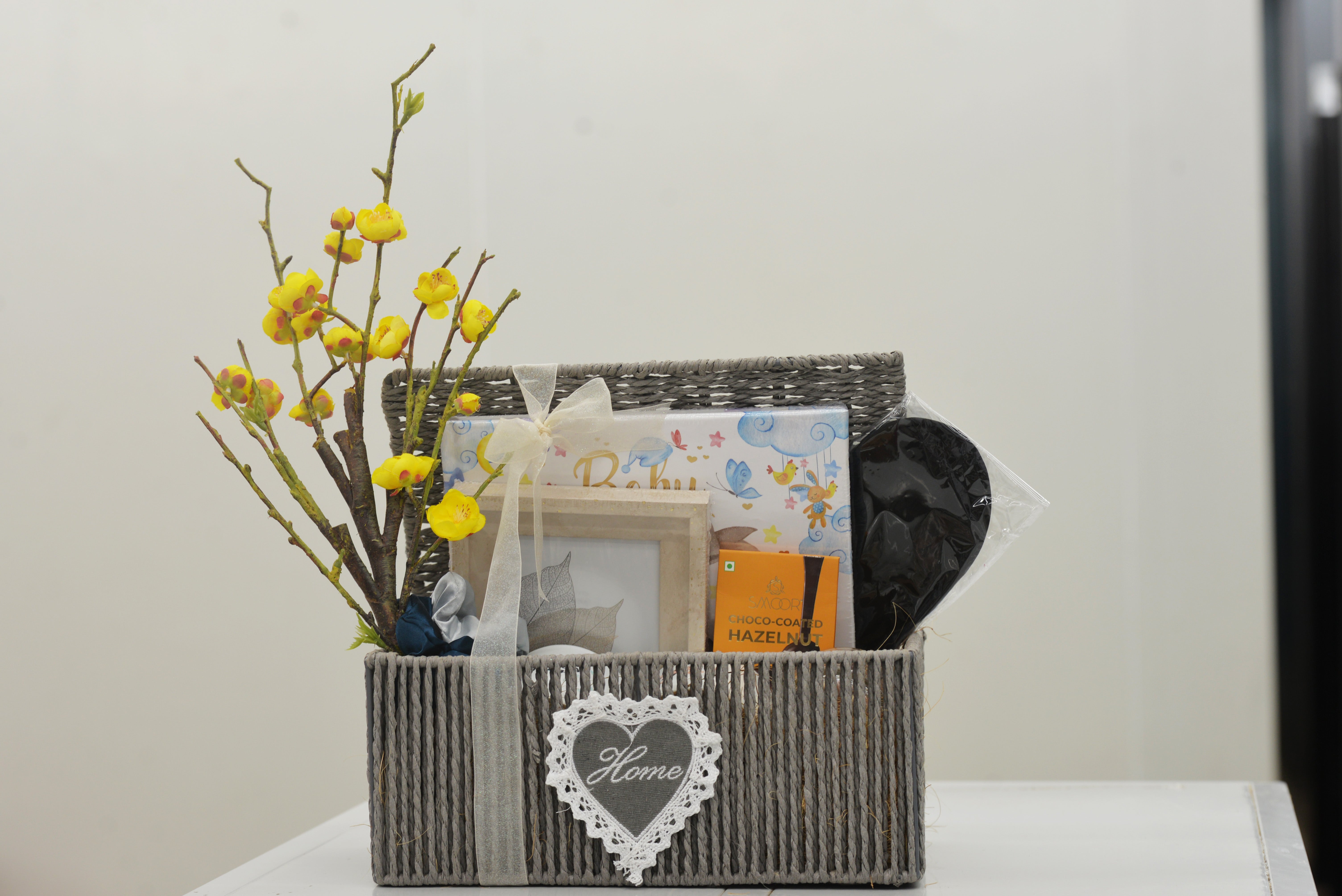 Close Basket (Wicker) x Baby Record Book x Eye Mask x Dry Fruits with Jar x Smoor Choco-Coated Hazelnut chocolates x 2 Set Mug with Printing (Custom 'Daddy's Mug' & 'Mummy's Mug' printed ceramic mugs ) x Photo Frame x Scrunchies