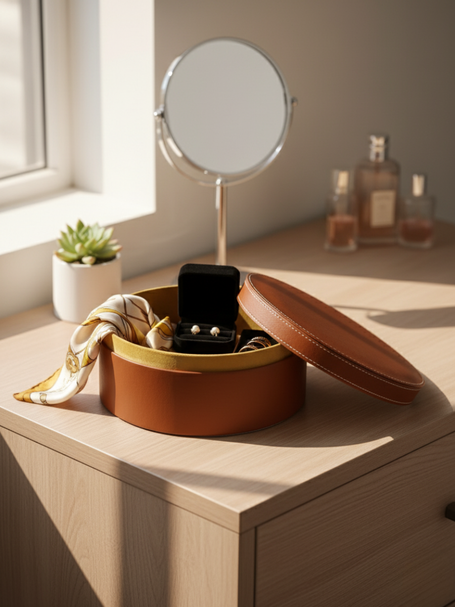 Cognac Round Multi-Purpose Storage Box with Lid - Faux Leather Finish
