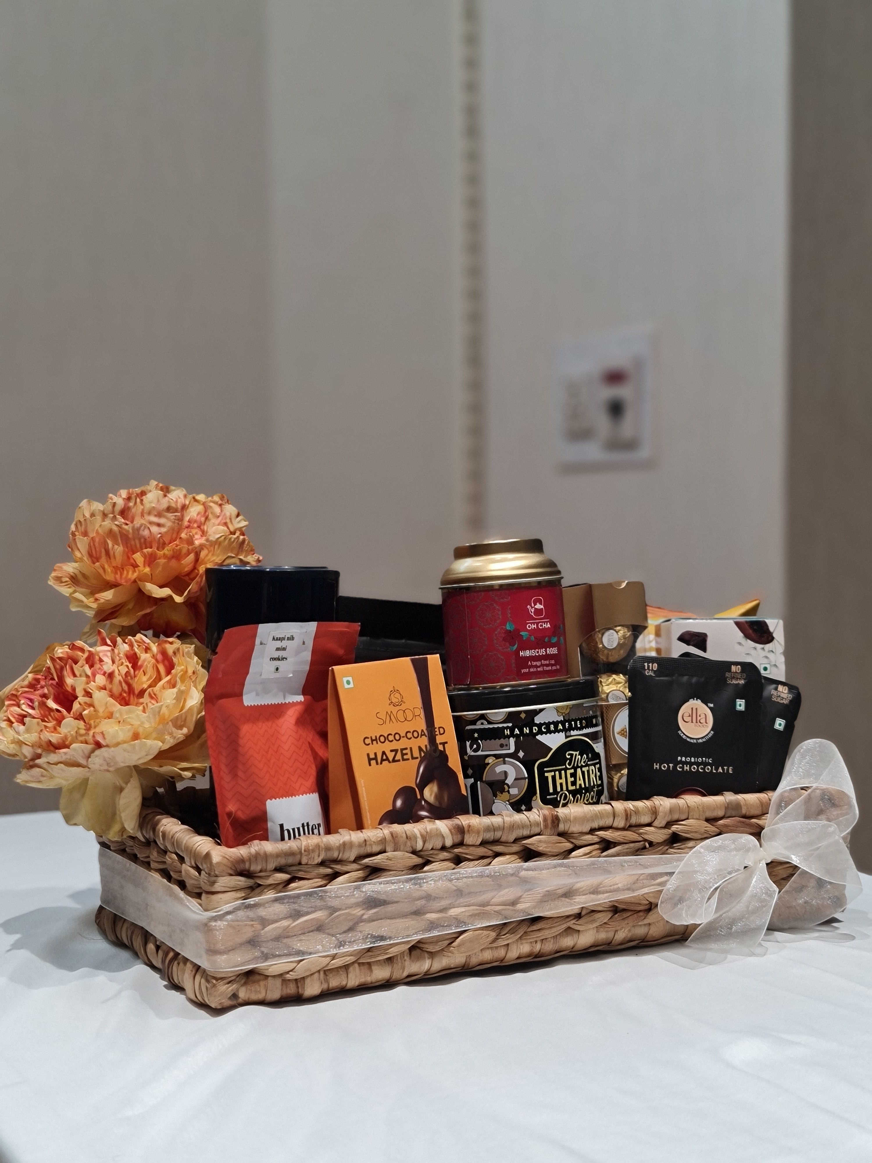 Delight your loved ones with this exquisite hamper featuring 12 premium gourmet items. Includes Davidoff coffee, Smoor coco-coated hazelnuts, Butterside Off cookies, Oh Cha Hibiscus Rose tea, roasted cashews, Theatre Project popcorn, healthy Jowar cookies, Ragi chips, hot chocolate, and Ferrero Rocher. Beautifully presented in a rustic wicker basket.