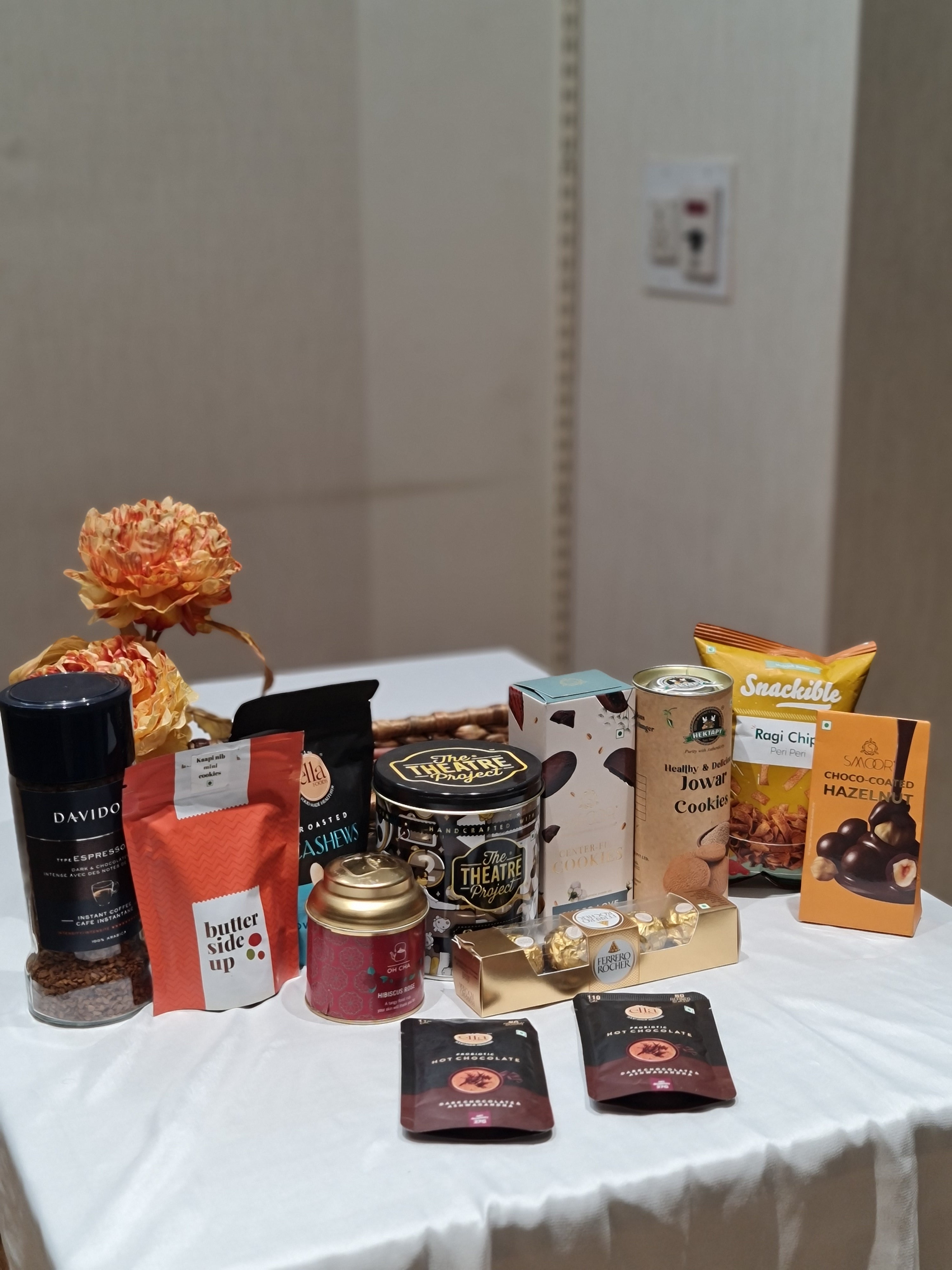 Health-Conscious Options: Includes nutritious choices like Jowar cookies, Ragi chips, and roasted cashews alongside indulgent treats for balanced snacking