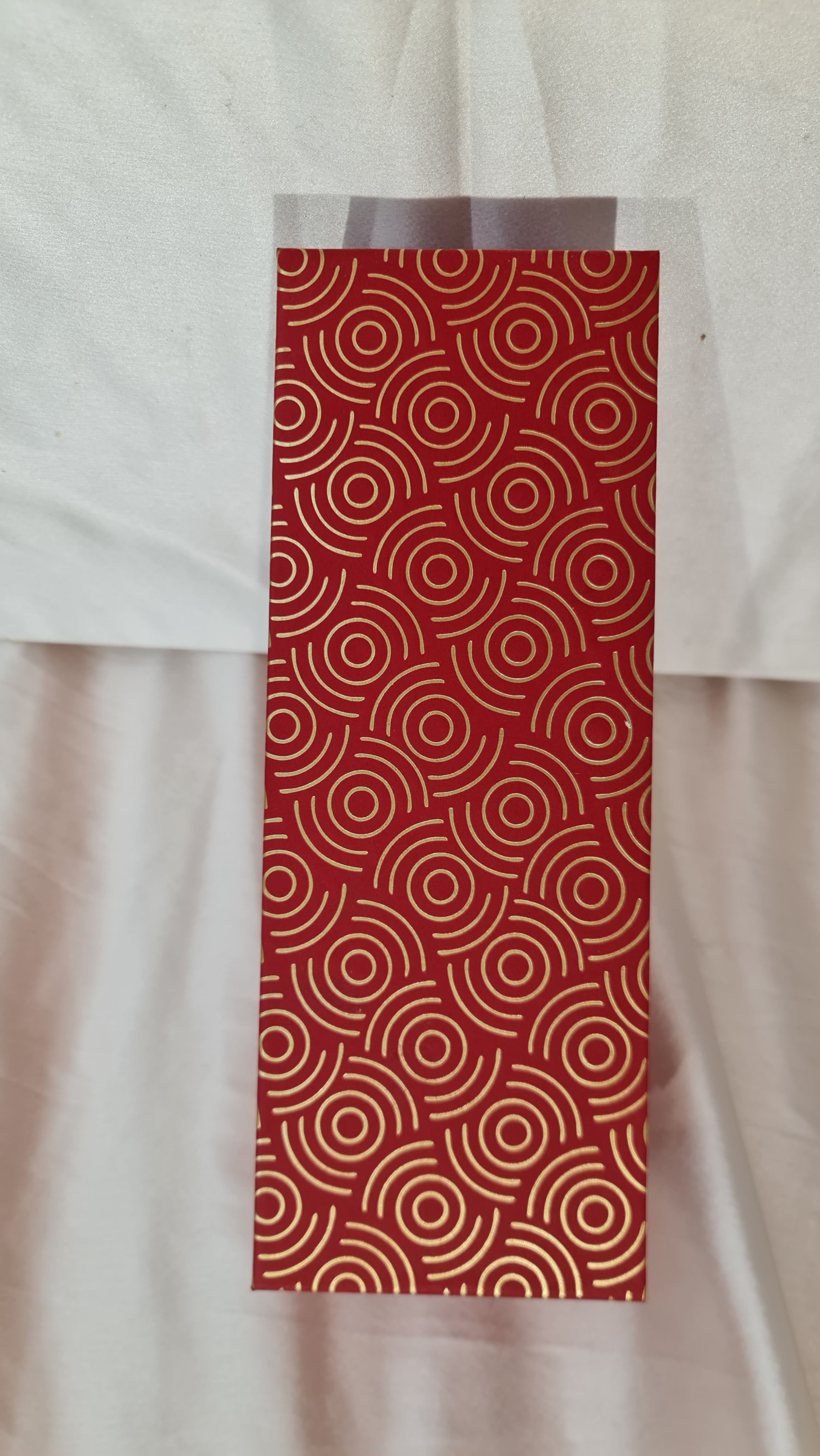 Present your gifts elegantly with our compact red rigid rectangle box (26cm x 9.5cm x 10cm) featuring a stunning metallic gold geometric pattern. This slim, elongated design is perfectly sized for wine bottles, champagne, chocolate boxes, jewelry, ties, scarves, and other slim gift items.