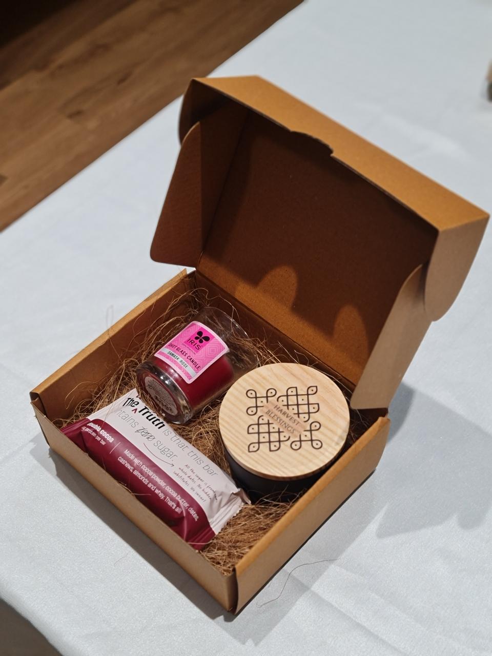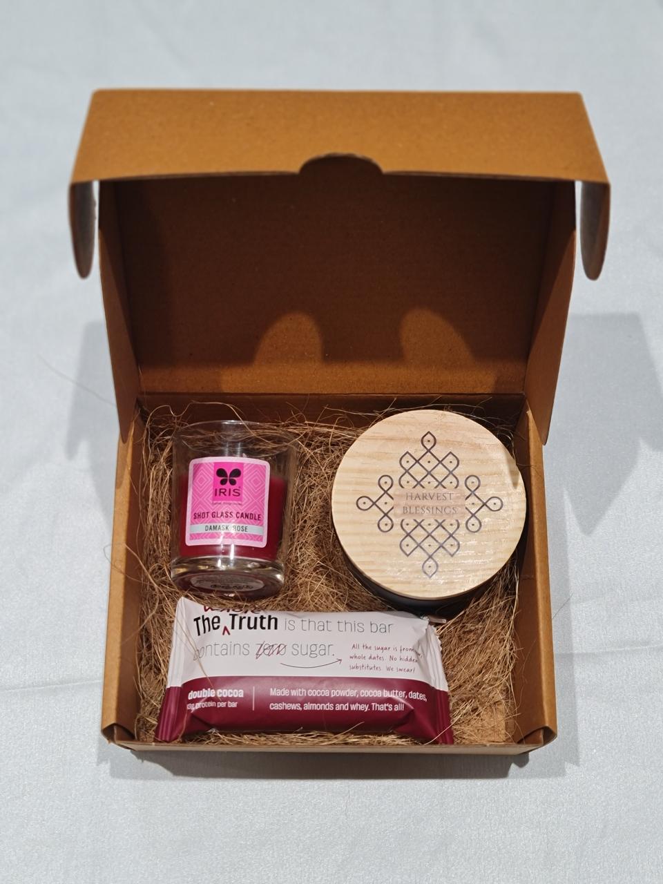 Gift Box + Jar with Dry Fruits (50 gm) + Scented Candle + Whole Truth Protein Bar + Ribbon Wrapping