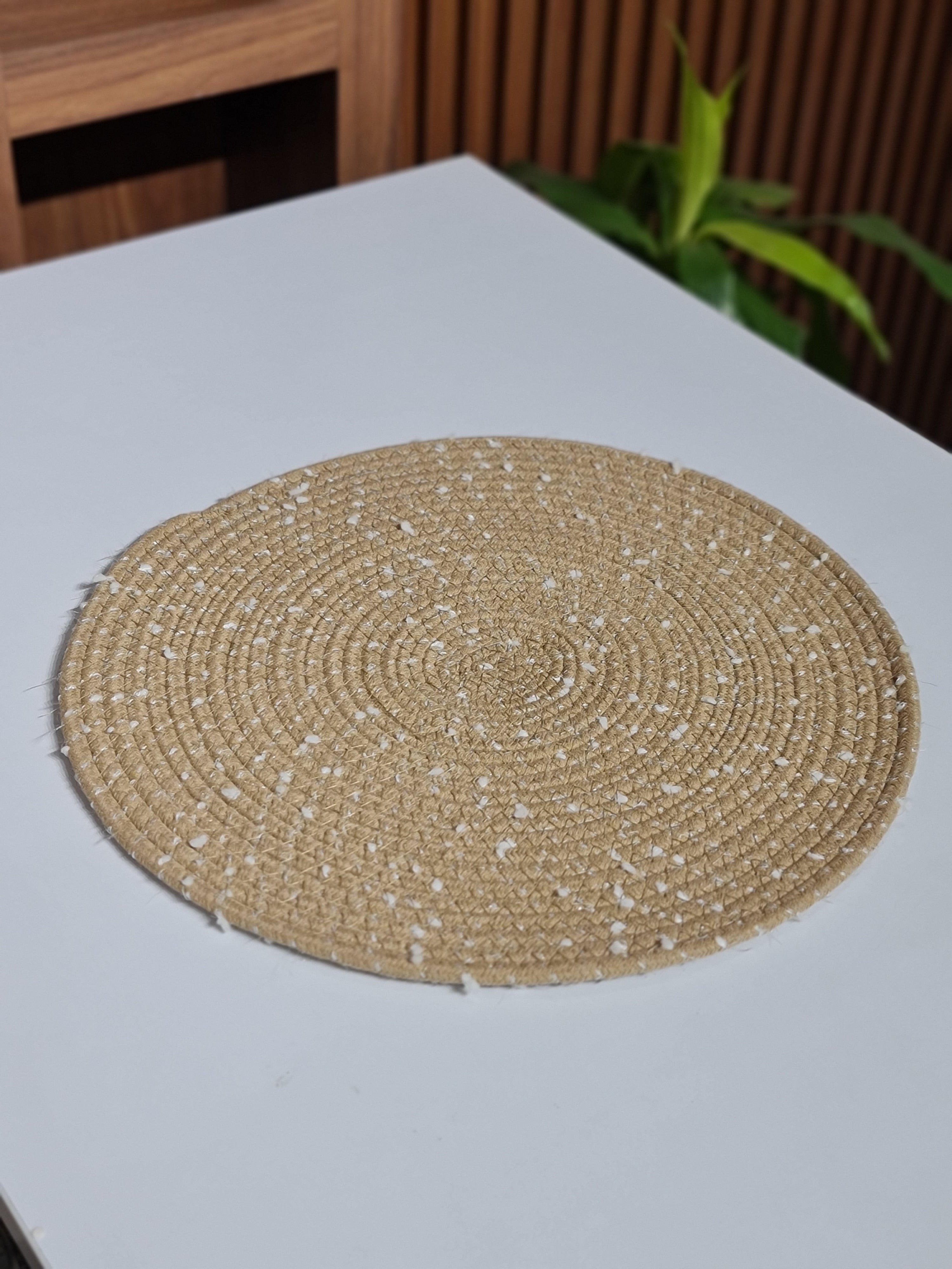 Made from 100% natural jute fibers, these eco-friendly mats showcase intricate circular weaving patterns with delicate white polka dot accents. The neutral beige tone complements any décor style, from casual to contemporary.