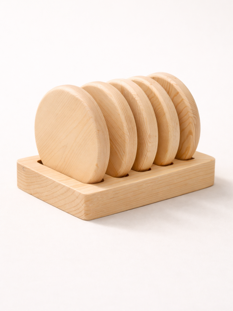 Elevate your table setting with this elegant round pine wood coaster set, crafted from premium natural pine for durability and timeless appeal. This 5-piece collection features smooth, circular coasters that protect your surfaces while adding a warm, organic touch to any space. The accompanying wooden holder keeps your coasters neatly organized and easily accessible, making it both a practical and decorative addition to your home or office. Each coaster showcases the beautiful natural grain of pine wood, ensuring no two pieces are exactly alike. Perfect for hot or cold beverages, these multipurpose coasters combine functionality with minimalist Scandinavian-inspired design.