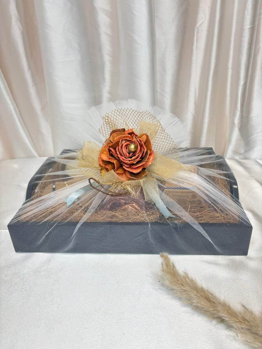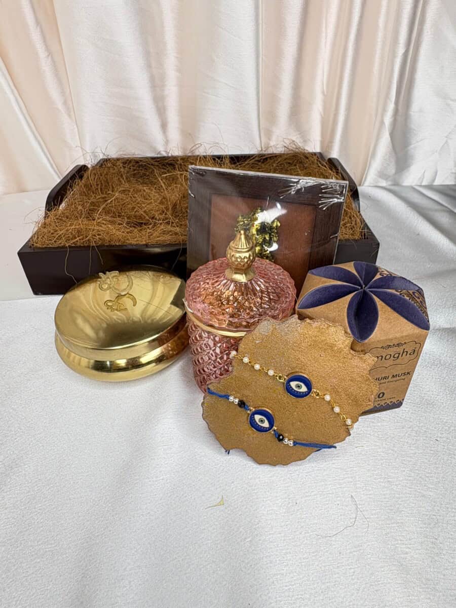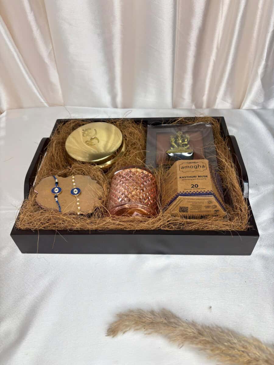 Sibling Love Hamper Celebrate the sacred bond of sibling love with our thoughtfully curated Sibling Love Hamper, beautifully presented on a sturdy Brown Tray. This exquisite hamper is designed to bless your beloved Bhaiya and Bhabhi with love, prosperity, and happiness.