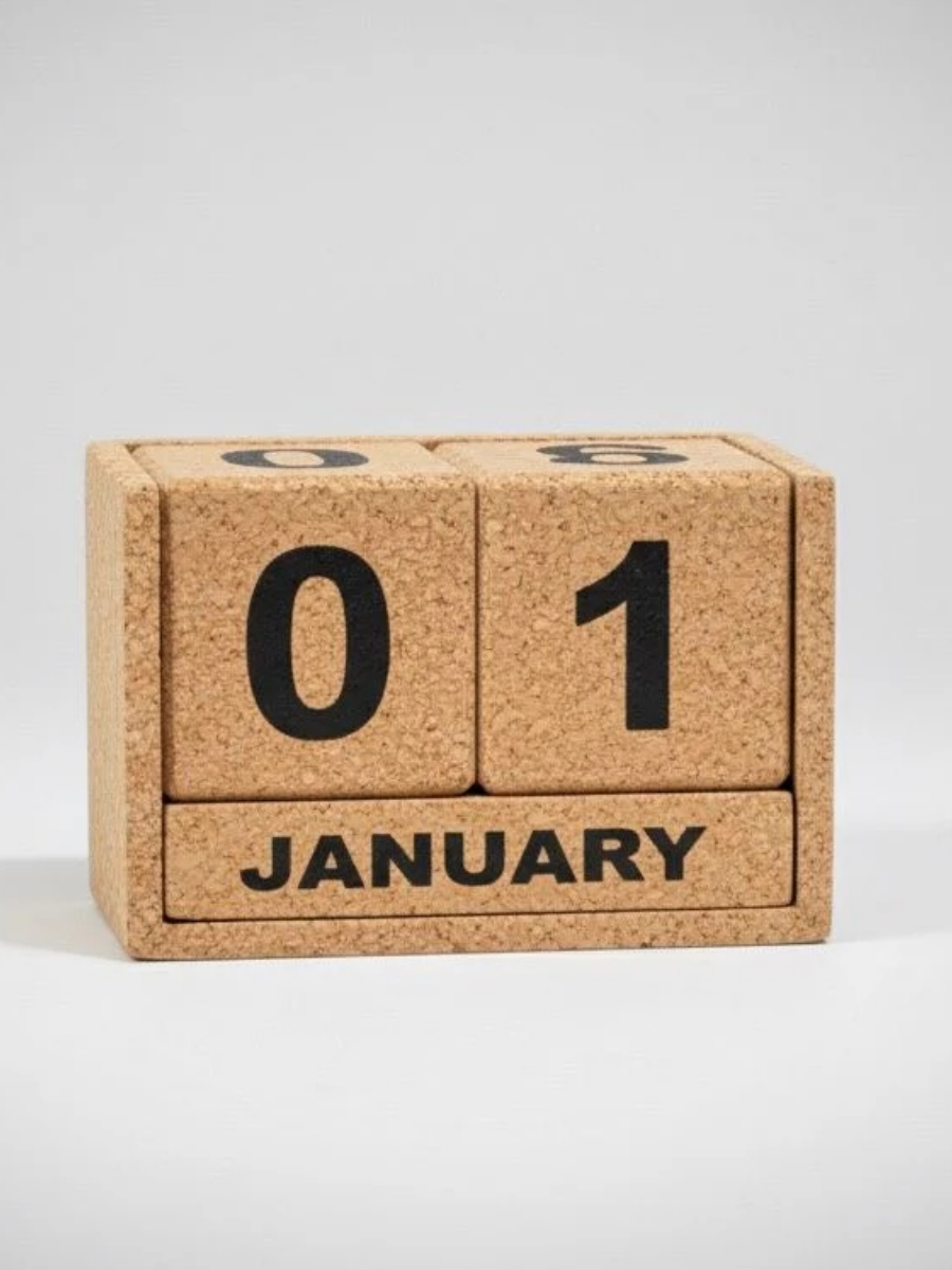 SUSTAINABLE CORK DESK CALENDAR – Unique perpetual calendar made from natural cork and wood with changeable date blocks, reusable year after year, eliminating paper waste while adding rustic charm to any workspace