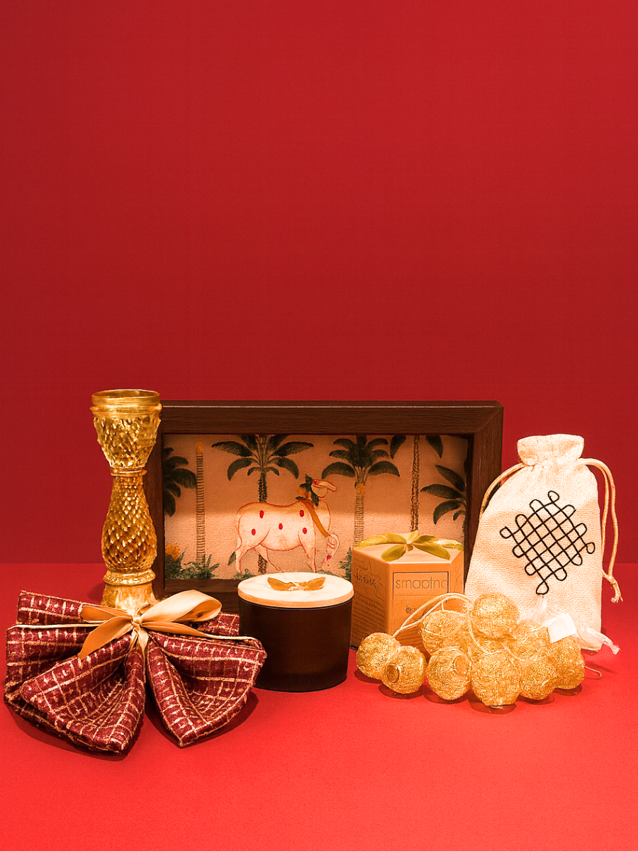 Reusable & Sustainable - Beautiful pieces like the Pichwai tray, glass candle jar, and potli bag serve long after the occasion